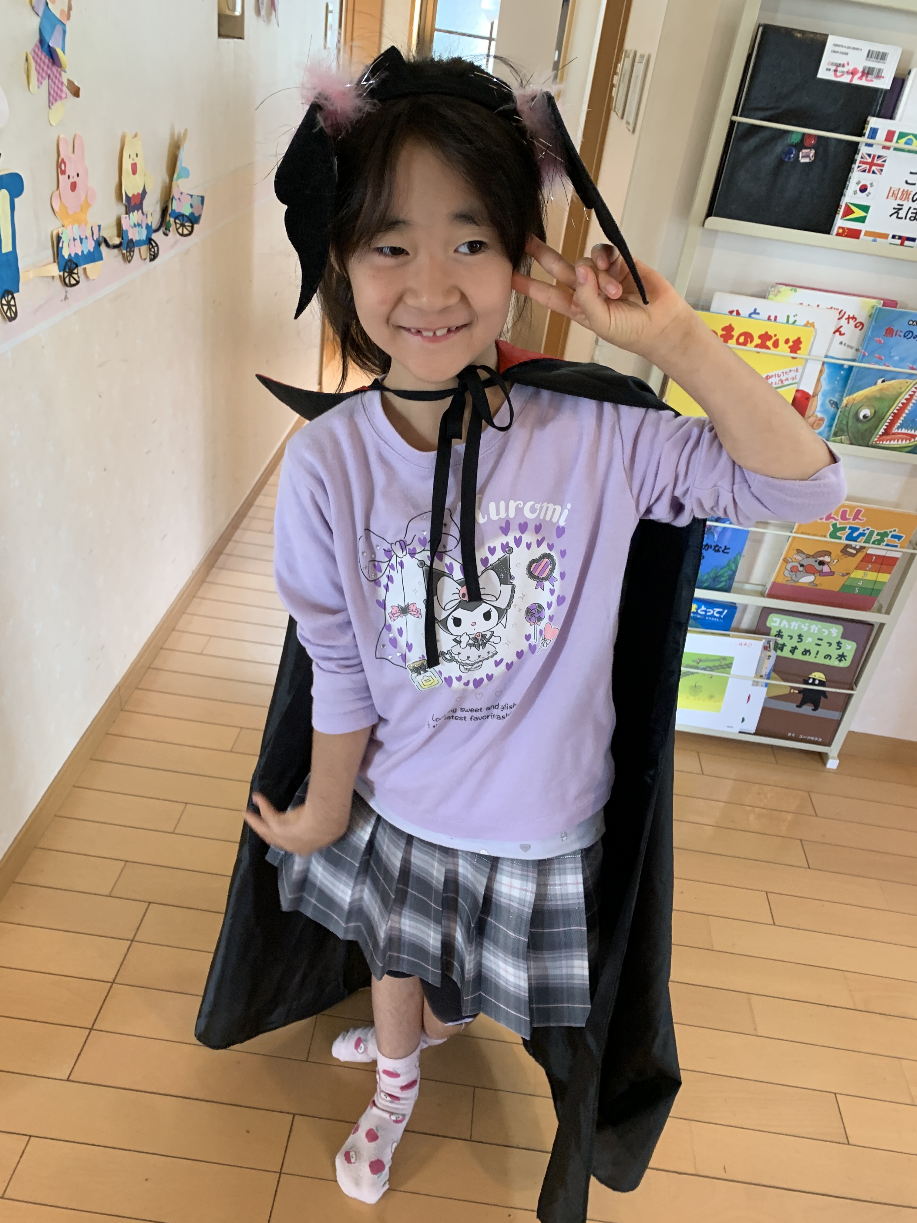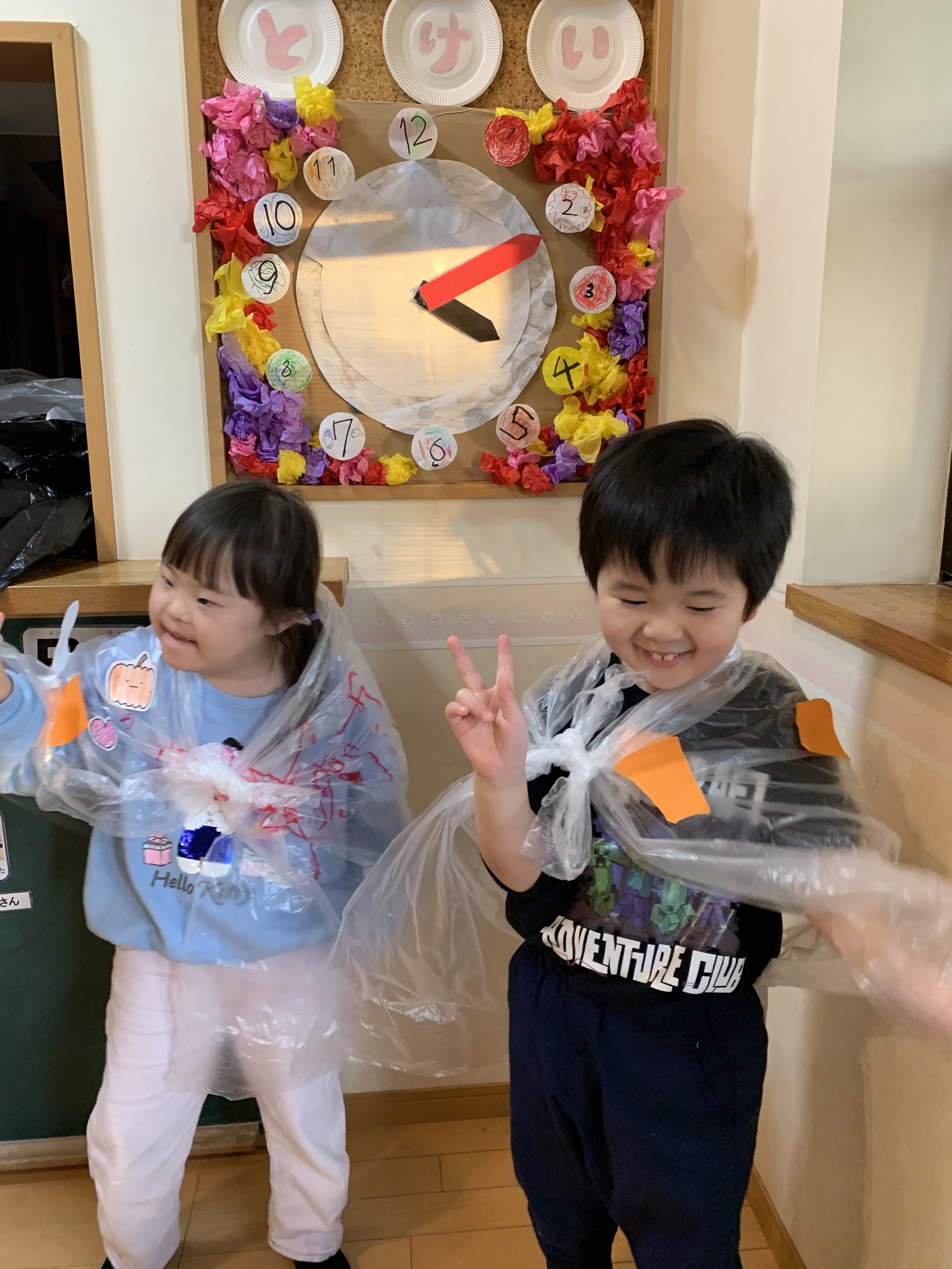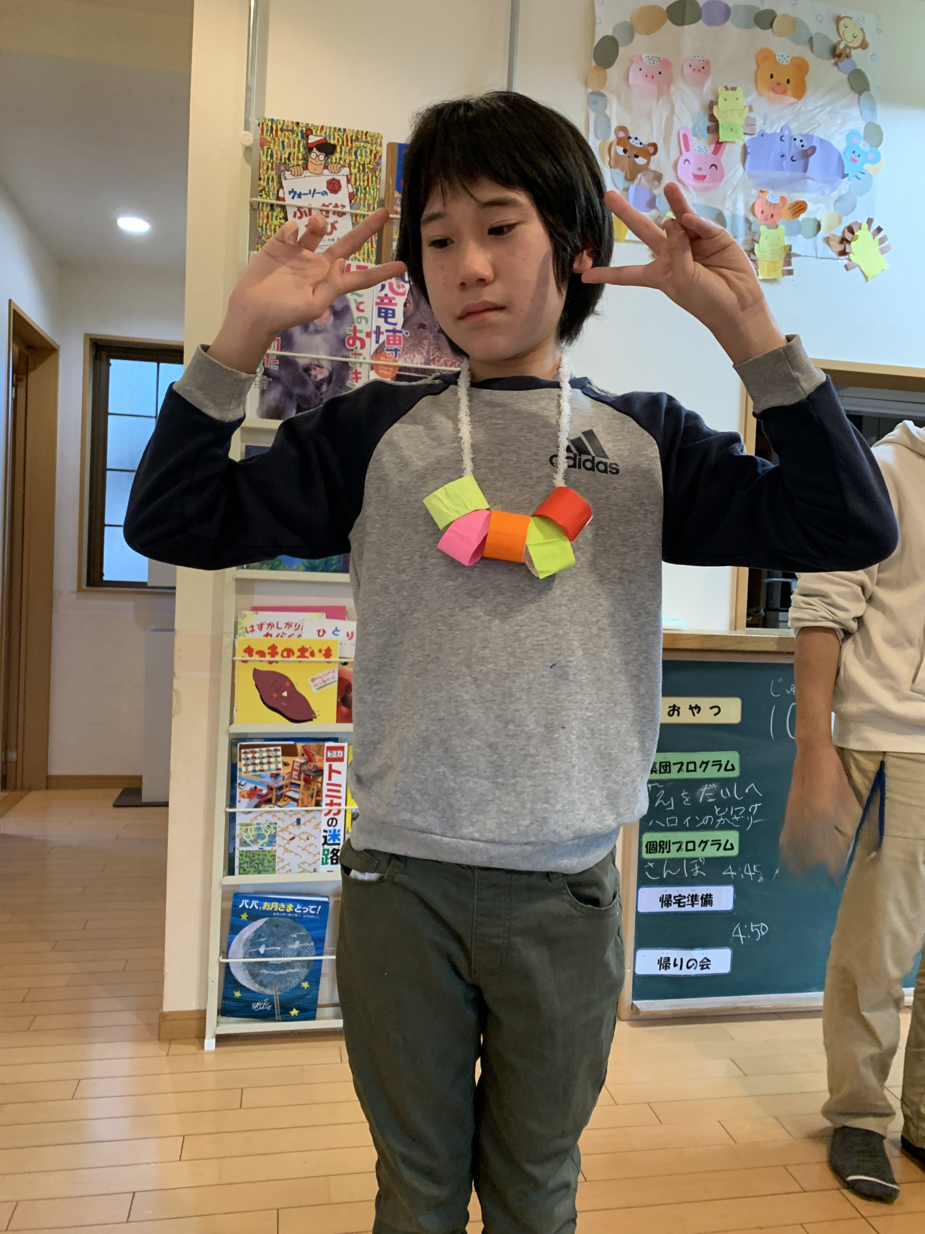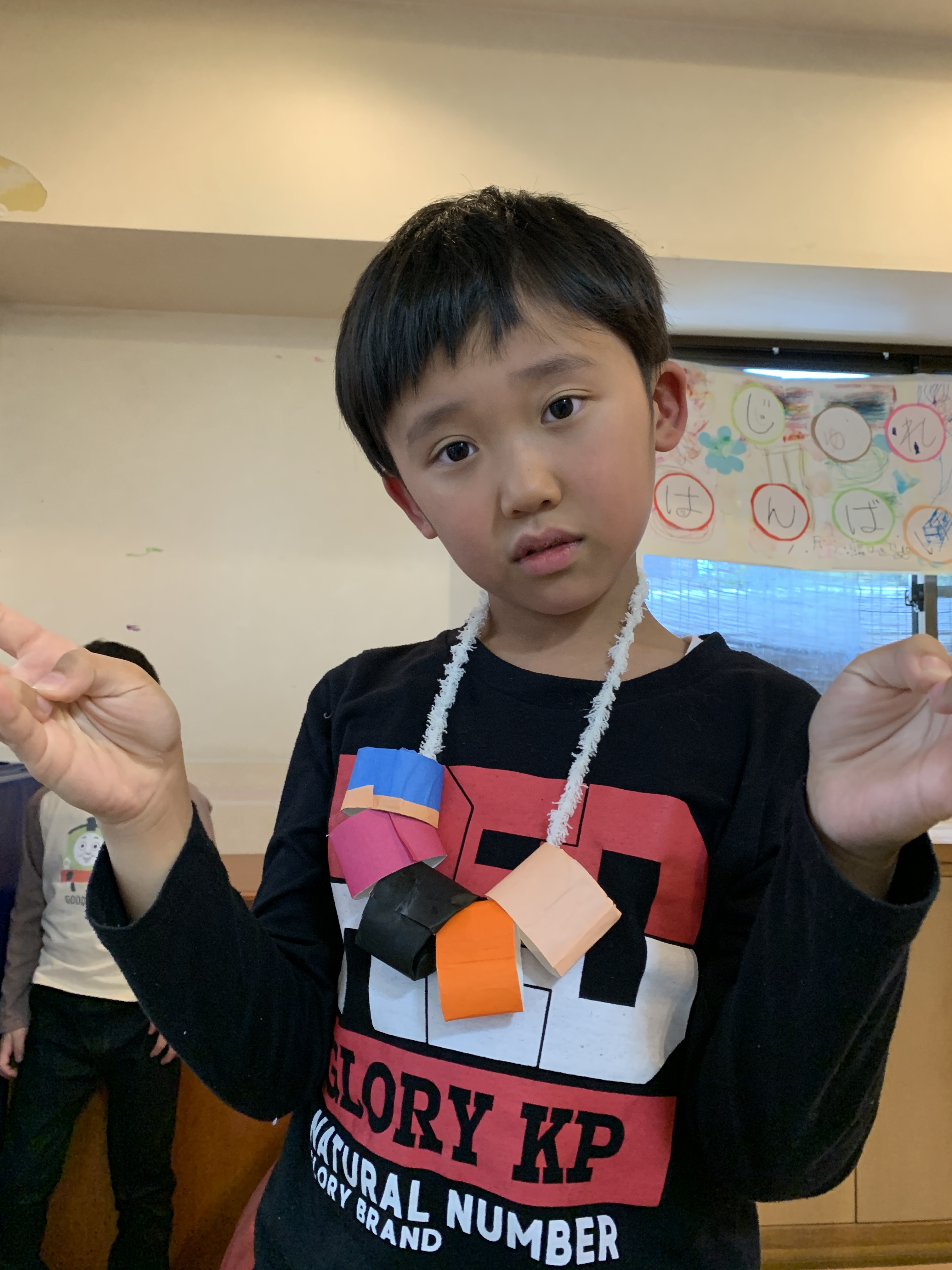 制作で作った首飾りやマントをつけてはいポーズ!