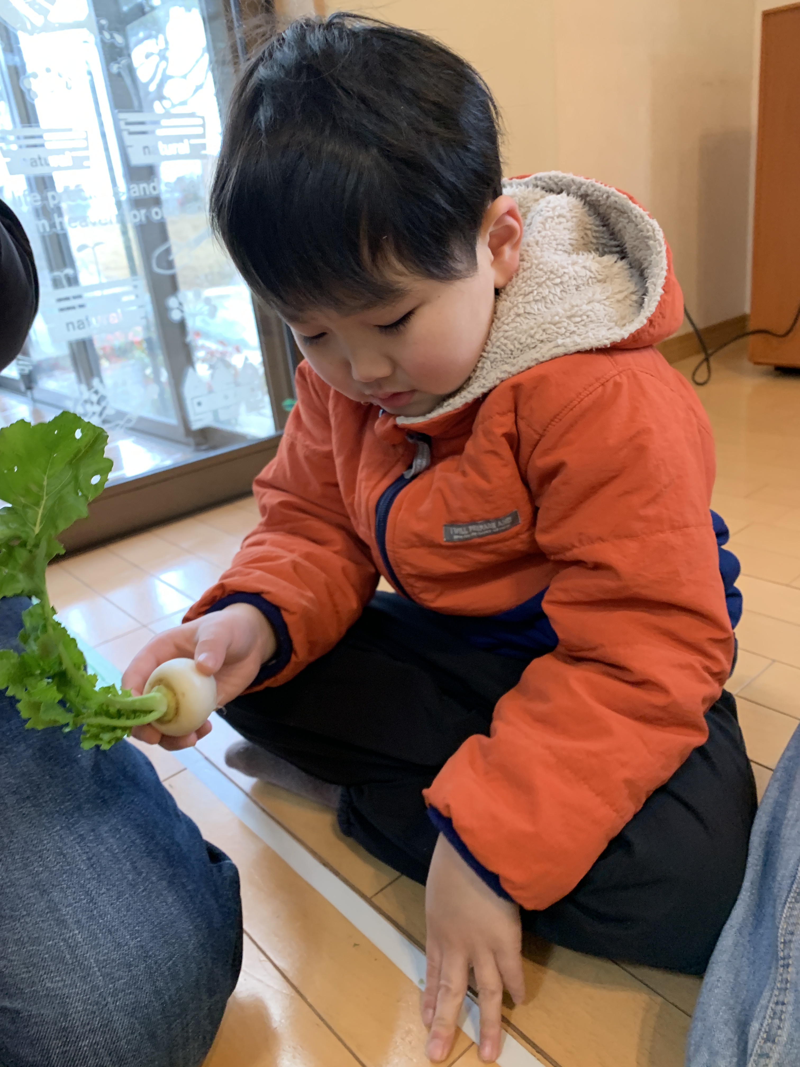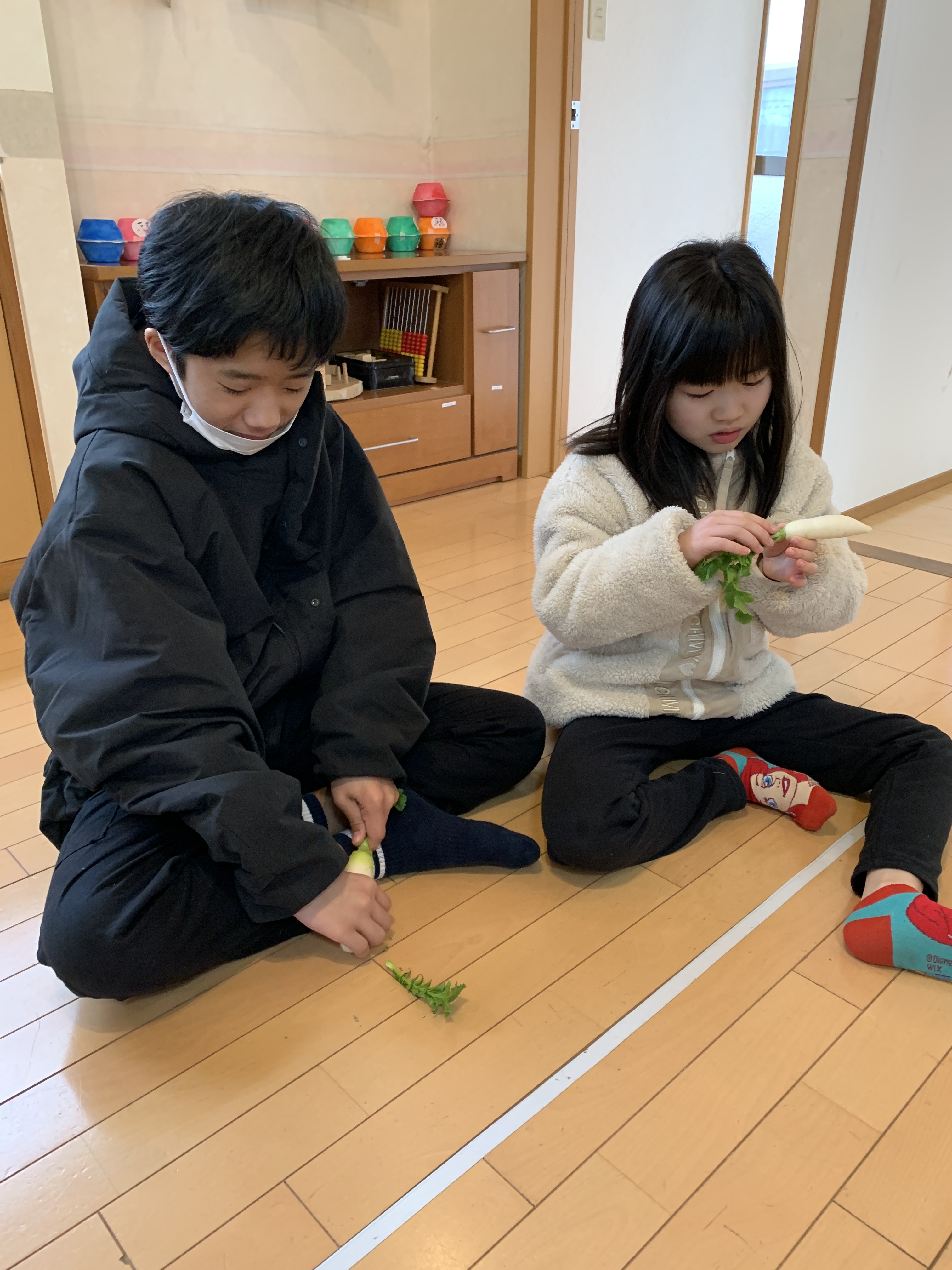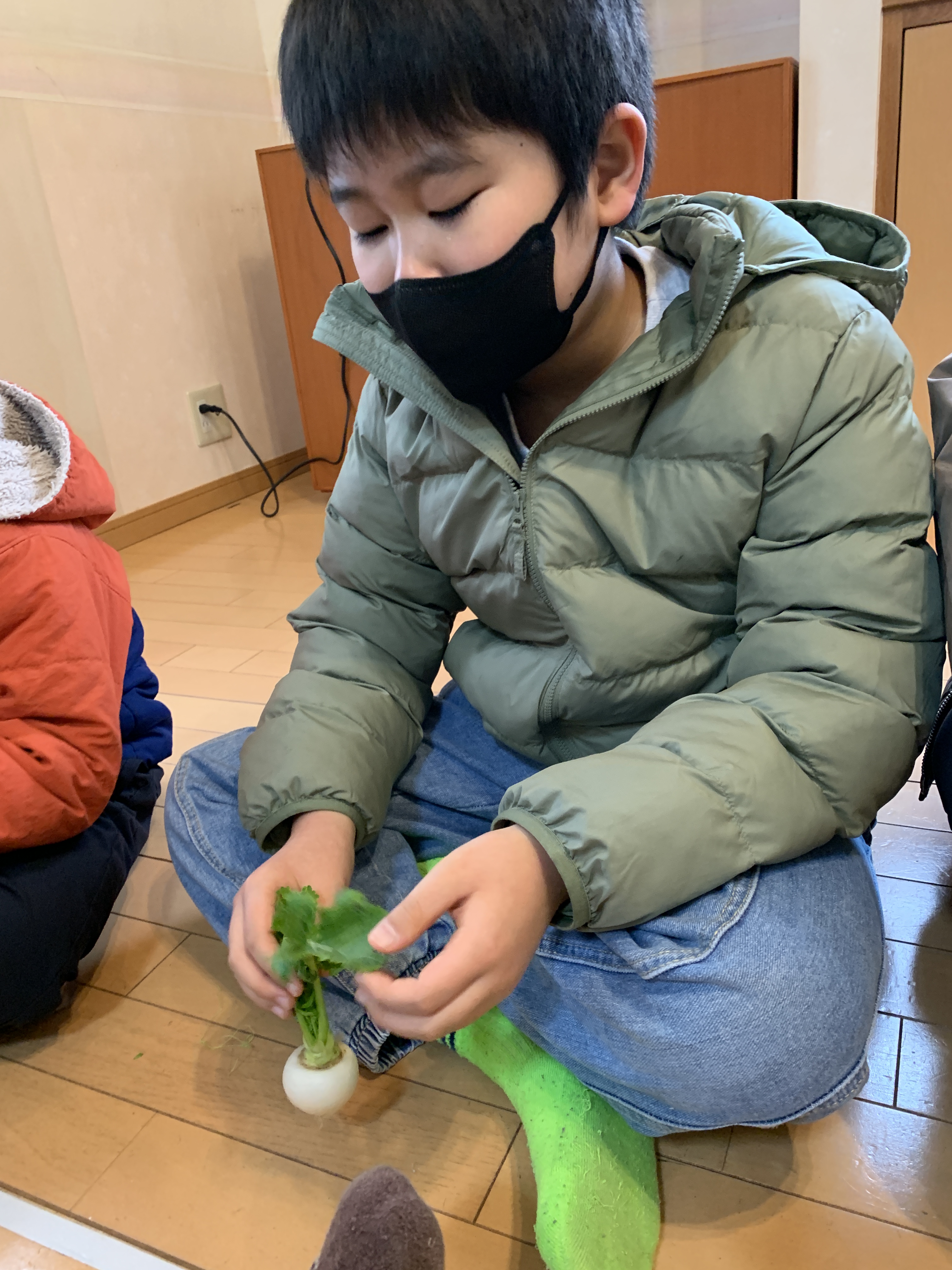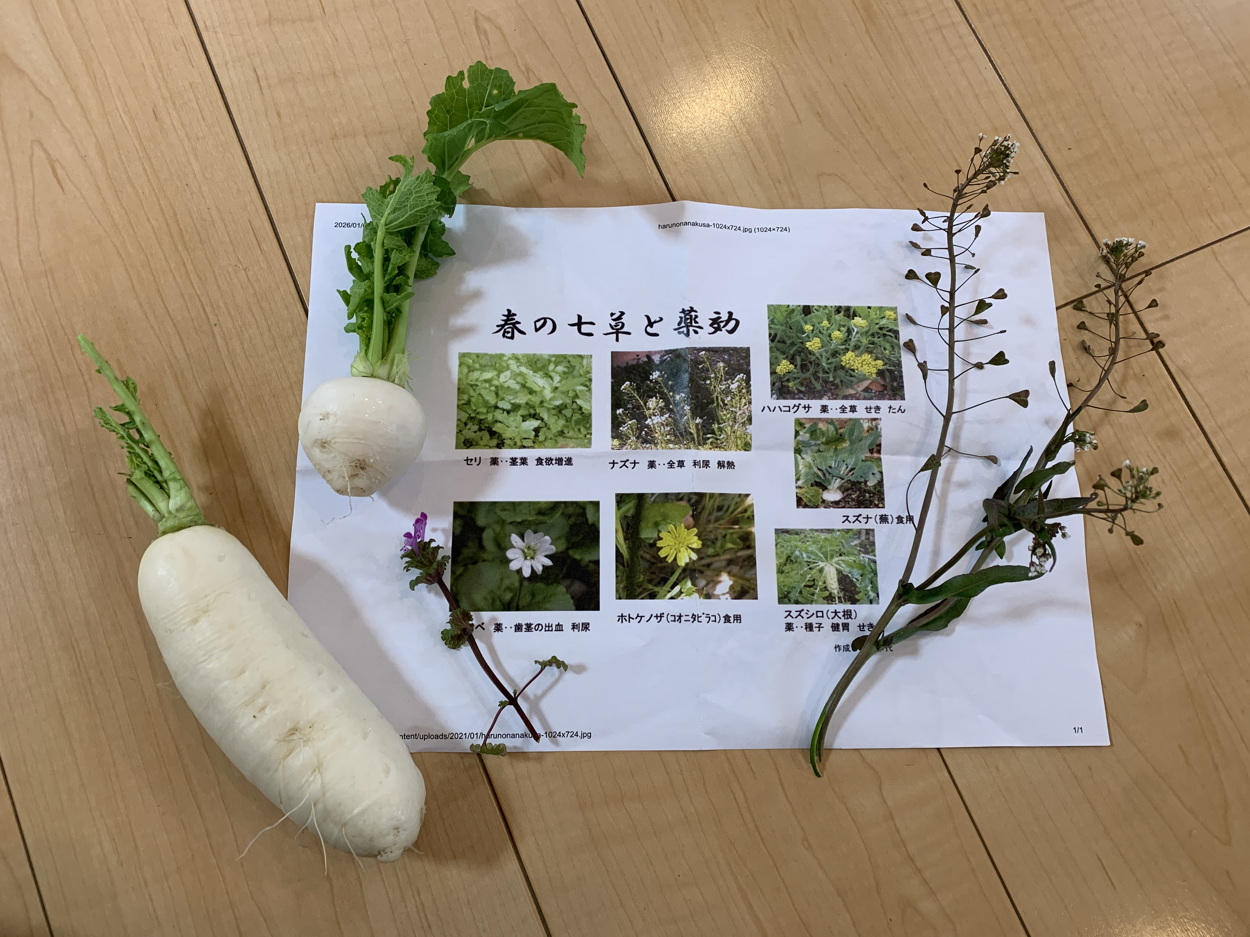 活動で七草の中の2つスズナとスズシロを手で触って、匂いを嗅いだりしました。